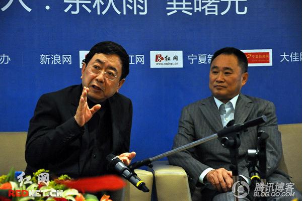 銀川書博會(huì)期間,龔曙光董事長(zhǎng)(右)和余秋雨先生(左)就文明傳播者的當(dāng)代使命進(jìn)行對(duì)話。