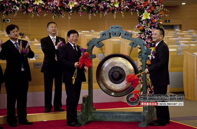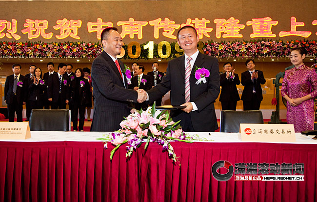 紅網上海10月29日訊(瀟湘晨報記者 張冬萍)在這個充滿創意、夢想和機遇的舞臺上,已經很久沒有出現過龍頭的身影,一切靜默只為期待中南傳媒的到來。10月28日,在國家新聞出版總署副署長鄔書林等領導的見證下,湖南省委常委、宣傳部長路建平與中南傳媒董事長龔曙光一道鳴鑼開市,代碼為“601098”的中南傳媒正式登陸上海證券交易所,掛牌首日漲30%,股票市值達到248億元,一躍成為出版傳媒板塊資產規模最大、股票市值最高的新龍頭。