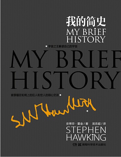 2014年7月25日,在湖南科學技術出版社“首席編輯薦書”活動中,史蒂芬·霍金新作《我的簡史》上市發布。與之前的《霍金傳》、《飛向無限》這兩本由別人撰寫的傳記不同,這是第一本由霍金親自著述的自傳。該書定價42元,由中南出版傳媒集團旗下湖南科學技術出版社出版發行,首印達到了50000冊,將通過全國的新華書店、網上書店等渠道公開發行。其特別設計的霍金親筆簽名的鏤空封面和精裝效果,使本書兼具很好的閱讀價值和收藏價值。