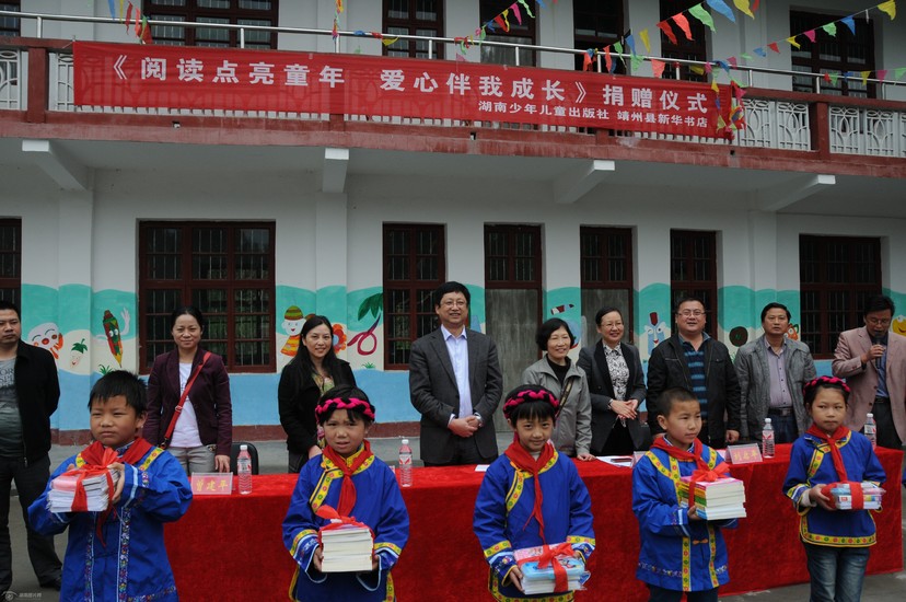 巖灣小學地處靖州最偏遠地區,離縣城60公里,條件非常艱苦,辦公和生活設施落后,同時又是周邊4個村唯一的學校,現有110名學生。2012年8月,珠海市政府干部貝華退休后,義務到這里支教,并積極為孩子們爭取現代教育資源??h教育局也著力為學校改善辦學條件,將教學樓、食堂改造一新,并建了籃球場和幼兒游樂場,開設了電腦室、圖書室、音樂教室,接收了捐贈校車,提供了免費午餐。但圖書室還是空蕩蕩的,給孩子們留下了一個遺憾。湖南少年兒童出版社了解情況后,募集了700余冊圖書、100套書包及文具、衣物等,派專人送到了學校。