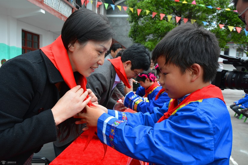 孩子們?yōu)閻?ài)心人士系上紅領(lǐng)巾。
